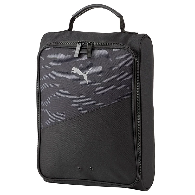 | Puma Golf Shoe Bag Durable Base With Ventilated Metal Eyelets The Puma Shoe Bag is the perfect accessory for your golf shoes and other essentials. It features a two way zip opening into the main compartment with an internal shoe divider and external pocket. – Simple Design Gives Ample Space For Any Size Shoes – Shoe Divider & External Zipped Pocket – Ventilated Metal Eyelets – Durable Base With Carry Handle – Two Way Zipper Design – Puma Cat Logo – Camo Print Finish |